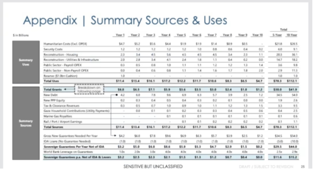 这份演示文稿被标记为“敏感但非机密”,并未详细说明哪些国家或公司将为加沙的重建提供资金,也未具体说明在重建期间,200万流离失所的巴勒斯坦人将栖身何处。